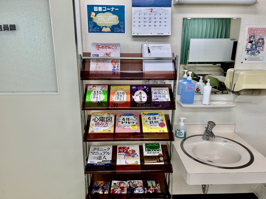 たとえば、当院の智美先生おすすめの人気医療マンガ「フラジャイル」や、新人看護師向けの分かりやすい看護の本などがあります。休憩時間の息抜きに読んだり、仕事のヒントを見つけたりできます。