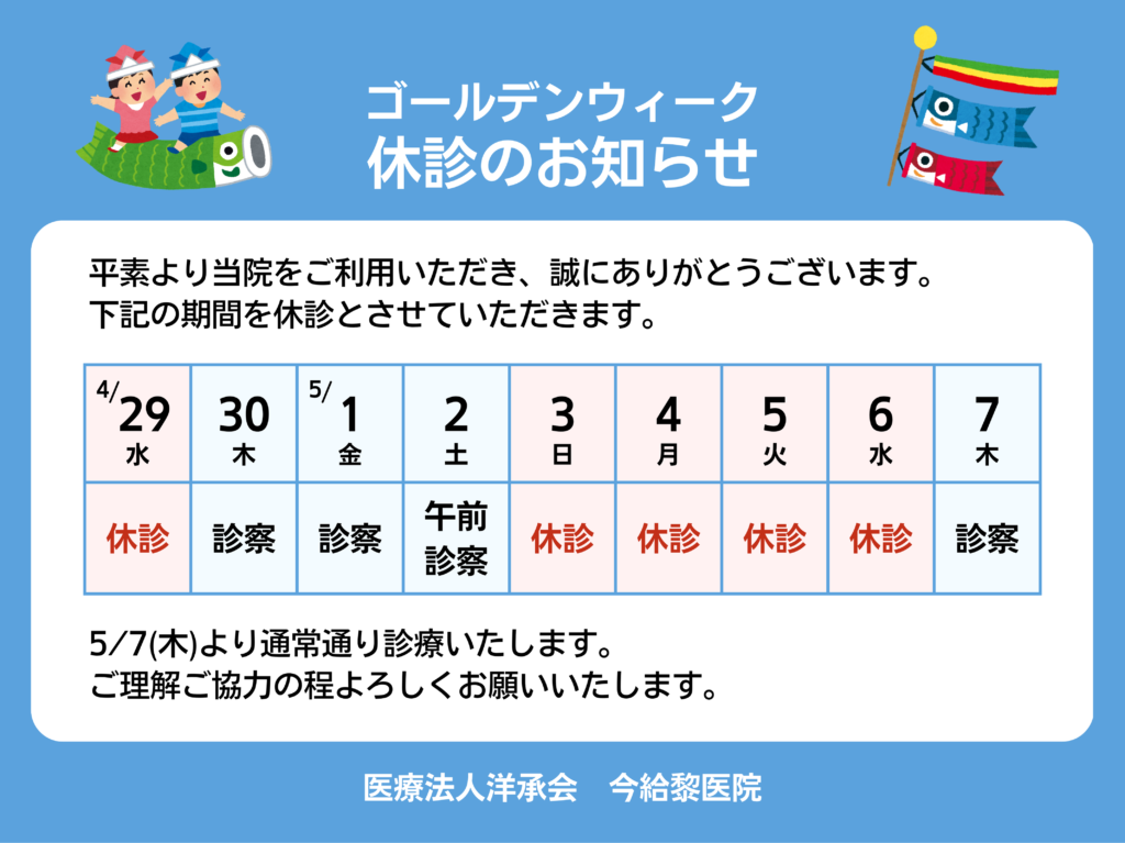 ゴールデンウィーク期間中の診療体制については下記の内容になっております。